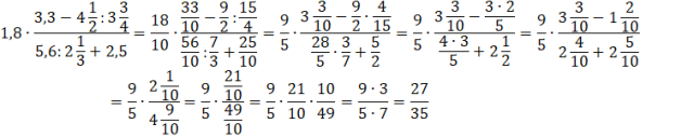 W tym zadaniu musisz najpierw wyliczyć licznik i mianownik oddzielnie, następnie podzielić licznik przez mianownik i na końcu przemnożyć przez liczbę stojącą przy ułamku. Zamień wszystkie ułamki dziesiętne na zwykłe.