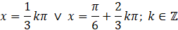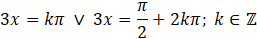 Rozwiąż otrzymane równania połączone spójnikiem „lub”. W tym celu znajdź ich przykładowe rozwiązania, a następnie korzystając z okresowości funkcji sinus, wyznacz wyniki w zbiorze liczb rzeczywistych.