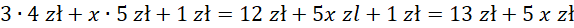 Porcja złożona z trzech gałek waniliowych (12 zł) x gałek czekoladowych (5x zł) i dużego wafelka (1 zł) kosztuje 5x + 13 [zł].