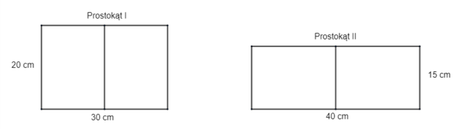 Wiedząc, że z mając dwie jednakowe kartki o wymiarach 15 cm x 20 cm można ułożyć prostokąt o dłuższym boku długości 30 cm albo prostokąt o dłuższym boku długości 40 cm, odpowiedz, czy krótszy bok prostokąta I ma długość 20 cm i czy pole prostokąta II jest równe 600 cm².