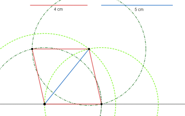Zastanów się, przekątna dzieli romb na dwa takie same trójkąty, a więc po narysowaniu trójkąta o bokach 4 cm, 5 cm, 4 cm, musisz dorysować do niego dwa brakujące boki po 4 cm każdy (oba trójkąty mają wspólną podstawę, którą jest przekątna). Na prostej odmierz za pomocą cyrkla odcinek 4 cm, a na jego końcach zatocz łuk o promieniu 4 cm i drugi o promieniu 5 cm – miejsce przecięcia to miejsce trzeciego wierzchołka rombu. Połącz ze sobą odcinki, tworząc trójkąta. Teraz na najdłuższym boku trójkąta, czyli na przekątnej rombu zatocz łuki o promieniu 4 cm każdy – miejsce ich przecięcia to miejsce ostatniego wierzchołka, połącz punkt z sąsiednimi, tworząc boki. Na koniec zaznacz, które odcinki to boki, a który to przekątna rombu.