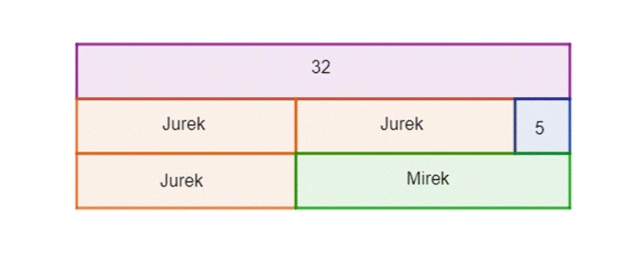 Możesz posłużyć się rysunkiem. Wiemy, że suma wieku Jurka i Mirka to 32 lata, a Mirek jest o 5 lat starszy, więc jego wiek można zapisać jako wiek Jurka powiększony o 5. W ten sposób dowiadujemy się, że suma podwojonego wieku Jurka i liczby 5 jest równa 32. Po pomniejszeniu obu stron o 5 dowiadujemy się, że podwojony wiek Jurka to 27 lat. Ta liczba nie jest podzielna przez 2, czyli wynik nie jest liczbą naturalną.