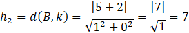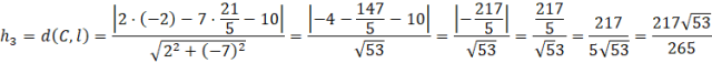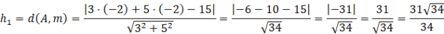 Wysokości trójkąta wyznaczam jako odległość wierzchołka od przeciwległego boku, a więc obliczam współrzędne wierzchołków tego trójkąta: