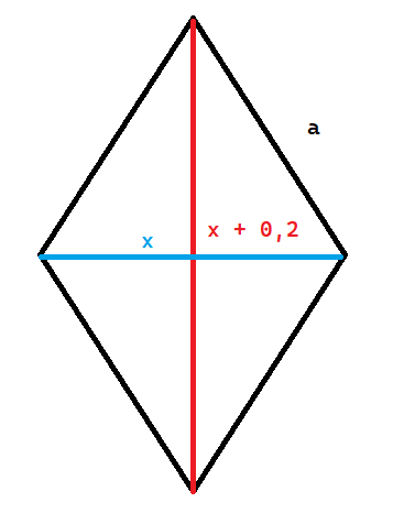 W tym zadaniu musisz obliczyć obwód rombu, na podstawie znajomości jego pola oraz informacji, że jedna przekątna jest o 0,2 m dłuższa od drugiej.