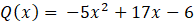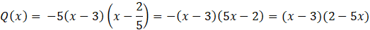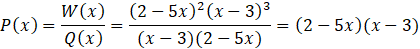 Aby rozwiązać zadanie, wyznacz wartość wielomianu P(x) jako iloraz wielomianów W(x) i Q(x). Następnie rozłóż wielomian Q(x) na czynniki – oblicz jego wyróżnik, a następnie miejsca zerowe, pomnóż jeden z wielomianów razy współczynnik a = -5. Zapisz iloraz W(x) i Q(x) w postaci ułamka zwykłego, który następnie skróć, otrzymując wielomian P(x).