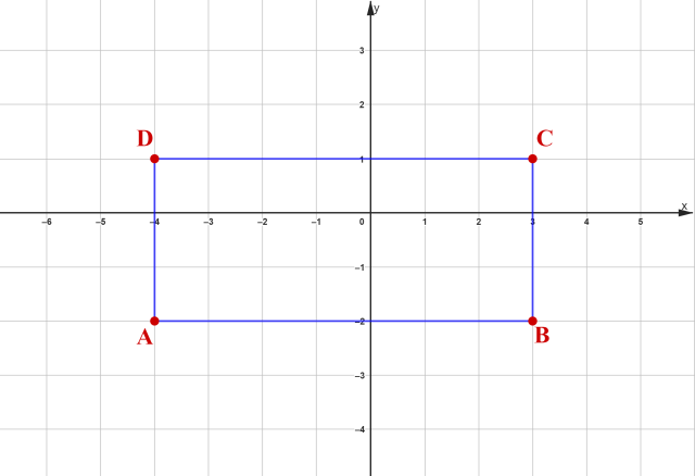 W tym zadaniu musisz obliczyć pole i obwód prostokąta o wierzchołkach A = (-4, -2), B = (3, -2), C = (3, 1), D = (-4, 1).
