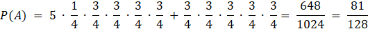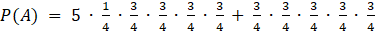 W tym zadaniu musisz obliczyć prawdopodobieństwo zdarzeń: A – liczba 2 wypadnie co najwyżej jeden raz, B – suma otrzymanych liczb jest równa 6, jeśli rzucamy 5 razy kostką o czterech ścianach z liczbami 1, 2, 3, 4.