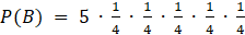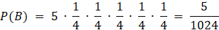 Aby liczba 2 wypadła tylko raz może zajść zdarzenie, że wypadła raz liczba 2, a pozostałe wyniki były różne od 2 i jest 5 możliwości takiego zdarzenia ze względu na kolejność wypadniętych liczb oraz zdarzenie, że wypadły same liczby różne od 2. Zsumuj otrzymane prawdopodobieństwa. Aby zaszło zdarzenie B, muszą wypaść liczby 1, 1, 1, 1, 2 w jednej z 5 możliwych kolejności. Otrzymasz więc