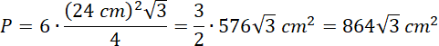 Pole sześciokąta oblicz, mnożąc 6 razy pole trójkąta równobocznego o boku równym 24 cm: