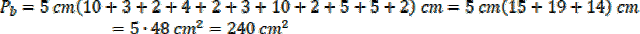 Pole powierzchni bocznej policz, mnożąc obwód figury, w podstawie przez wysokość równą 5 cm: