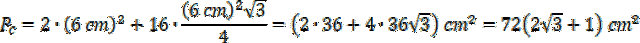 Policz pole powierzchni całkowitej – będzie ono odpowiadać sumie dwóch kwadratów o boku 6 cm oraz 16 trójkątów foremnych o takiej samej krawędzi: