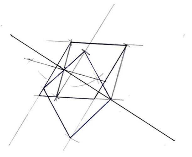 Skonstruuj romb – narysuj dwie proste równoległe, następnie połącz je bokiem rombu. Odłóż długość boku na prostych równoległych. Wyznacz symetralną boku i poprowadź prostą przechodzącą przez wierzchołek oraz środek przeciwległego boku. Z każdego wierzchołka poprowadź prostą prostopadłą narysowanej prostej. Następnie cyrklem odznacz odległości każdego punktu od prostej, wbijając cyrkiel w punkt przecięcia prostych. Połącz wyznaczone w ten sposób punkty symetryczne.
