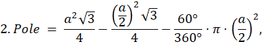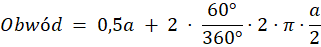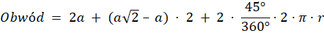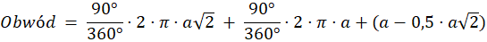 , gdzie α oznacza kąt zakreślony przez dany łuk, natomiast r oznacza promień danego łuku. Obwód danej figury oblicz sumując kolejne długości boków oraz łuków wykorzystując następujący wzór