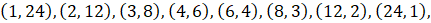 W parze, x będzie dzielnikami liczby 24, a y wartością wyniku ilorazu dla tego dzielnika.