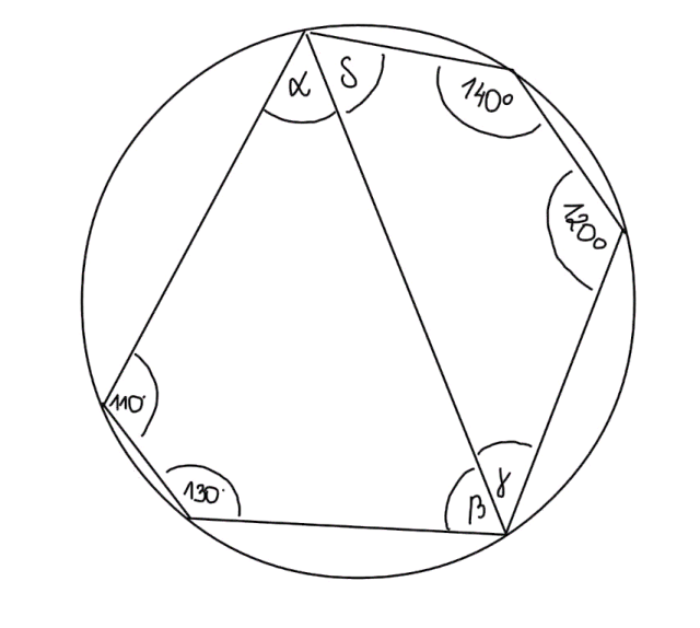 Zauważ, że okrąg opisany na sześciokącie jest również okręgiem opisany na dwóch czworokątach (powstały po poprowadzeniu przekątnej) Patrz na rysunek i przyjmij oznaczenia: