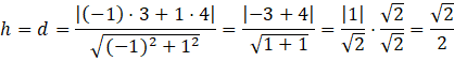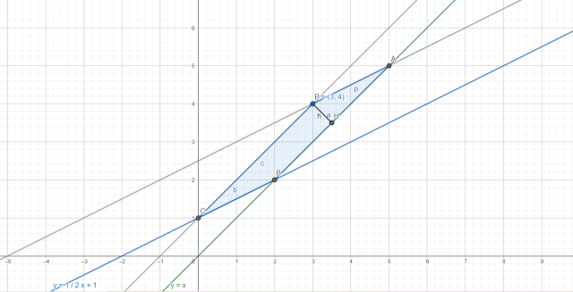 Długość jednej z wysokości to odległość punktu P od prostej y = x. Ponieważ długości naprzeciwległych boków są sobie równe, to długość boku, na który opada ta wysokość to |AB| lub |PC|. Jednakże w |PC| znamy jeden z punktów końcowych, czyli P.