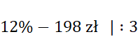 Wyznacz z proporcji pełną kwotę (100%) roweru, wiedząc, że 198 zł stanowi 12% tej ceny.