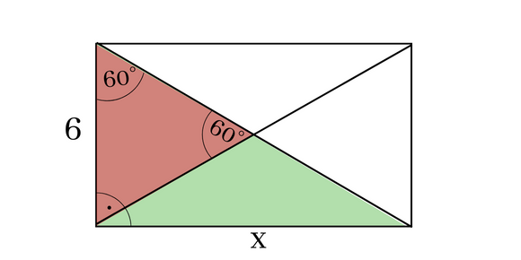 Zacznij od narysowania prostokąta wraz z przekątnymi. Następnie zauważ, że przecięcia przekątnych wraz z krótszym bokiem tworzą trójkąt równoboczny (zaznaczony na czerwono). Skorzystaj z definicji tangensa i wyznaczać miarę dłuższego boku.
