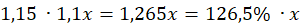 Pomnóż nieznaną wartość x przez 1,1, a następnie wynik przez 1,15, aby dowiedzieć się, o ile wzrosła cena akcji.