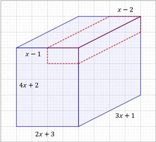 Wyznacz wielomiany opisujące pole powierzchni całkowitej i objętość bryły powstałej wskutek wycięcia prostopadłościanu o wymiarach