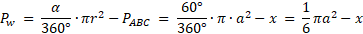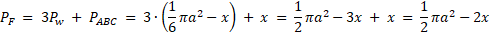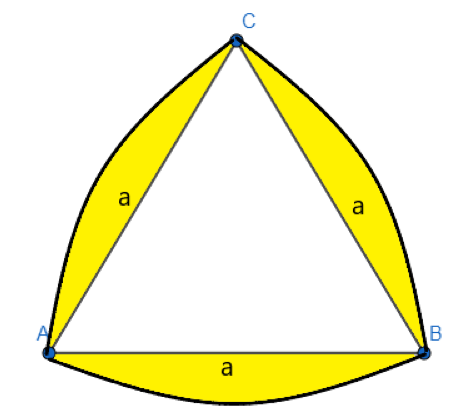 Figura na rysunku powstała przez zastąpienie boków trójkąta równobocznego łukami okręgów, z których każdy ma promień równy długości boku trójkąta i środek w jednym z wierzchołków. Jeśli bok trójkąta ma długość a cm, a pole trójkąta wynosi x cm²,to zapisz pole powierzchni całej figury.