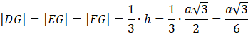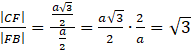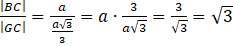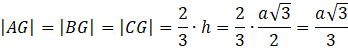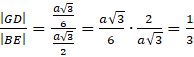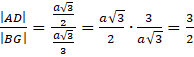 Wszystkie wysokości trójkąta równobocznego przecinają się w jednym punkcie G. Stosunek odcinka od wierzchołka do punktu G do odcinka od punktu G do boku wynosi 2 : 1.