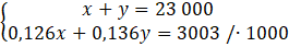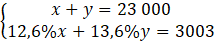 Na początku musisz oznaczyć symbolami pieniądze pożyczone w obu bankach. Następnie musisz zapisać pierwsze równanie, w którym suma tych pieniędzy wynosi 23 000. Drugim równaniem będzie to, że suma 12,6% kwoty pożyczonej w pierwszym banku i 13,6% kwoty pożyczonej w drugim banku wynosi 3003.