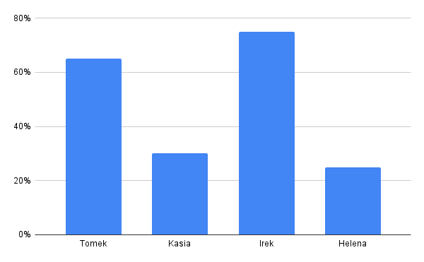 W tym zadaniu przeanalizuj podany wykres i ustal, ile wynosi procentowy udział wydatków z kieszonkowego poszczególnych dzieci. Następnie sporządź diagram słupkowy prezentujący otrzymane wyniki.