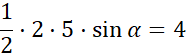 W tym zadaniu oblicz, jaką miarę ma kąt trójkąta leżący pomiędzy bokami o długościach 2 cm i 5 cm, jeśli jego pole jest równe 4 cm2.
