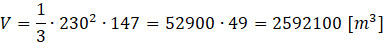 Oblicz objętość Piramidy Cheopsa, która po wybudowaniu miała kształt ostrosłupa prawidłowego czworokątnego o wysokości prawie 147 m i krawędzi podstawy równą 230 m.