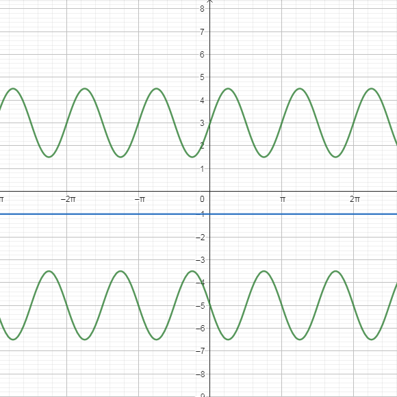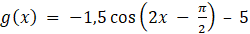 Aby znaleźć wzór funkcji g, należy przeanalizować, jakie przekształcenia względem funkcji f zostały wykonane przy szkicowaniu symetrycznej względem prostej y = -1 funkcji g: funkcja g została odbita symetrycznie względem wspomnianej prostej; funkcja g ma taki sam zbiór wartości, jak funkcja f; funkcja g jest przesunięta w lewo o taką samą wartość względem funkcji cosinus, jak funkcja f; punkty, w których funkcja g osiąga wartości największe, są oddalone o tyle samo od prostej y = -1, co punkty, w których funkcja f osiąga wartości najmniejsze.