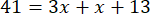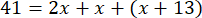 Obwód to suma długości wszystkich boków danej figury. Oznacz jako x krótszy bok, jak 2x – drugi bok, a jako x + 13 – trzeci. Ułóż równanie obrazujące sumę boków figury i rozwiąż je.