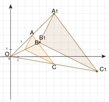 W tym zadaniu musisz narysować trójkąt ABC i połączyć każdy z jego wierzchołków z punktem (0,0). Następnie wydłuż każdy z odcinków OA, OB i OC dwukrotnie, aby otrzymać odcinki OA1, OB1 i OC1, które są równe i równoległe do poprzednich. Narysuj odcinki A1B1, B1C1 i A1C1, aby otrzymać nowy trójkąt A1B1C1. Porównaj współrzędne punktów A, B i C z punktami A1, B1 i C1.