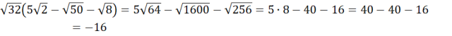Pomnóż każdą liczbę znajdującą się w nawiasie przez pierwiastek stojący przez nawiasem. Następnie oblicz wartość każdego z pierwiastków i oblicz wynik końcowego działania.