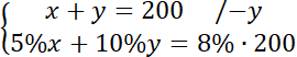 Ustal, ile było roztworu pięcioprocentowego, jeśli po zmieszaniu roztworów soli pięcio- i dziesięcioprocentowego otrzymano 200 g roztworu ośmioprocentowego.