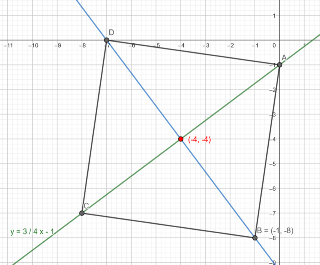 Narysuj proste zawierające przekątne kwadratu ABCD i odczytaj współrzędne ich przecięcia, jeśli prosta AC opisana jest równaniem