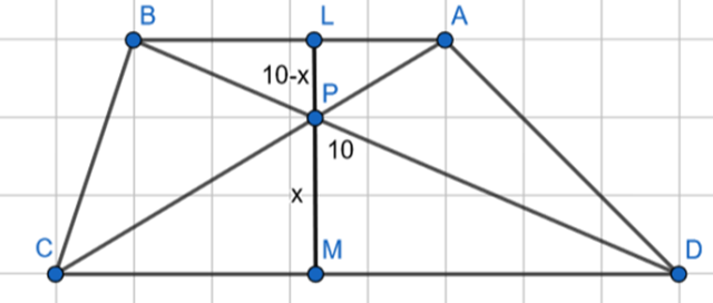 Oblicz odległość punktu P od podstaw trapezu, który jest miejscem przecięcia przekątnych trapezu o wysokości 10, jeśli stosunek pola trójkąta ABP do pola trójkąta CDP jest równy