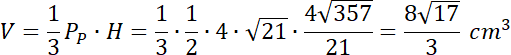 . Następnie ze wzoru na pole trójkąta wyznacz długość wysokości ostrosłupa i oblicz objętość bryły.