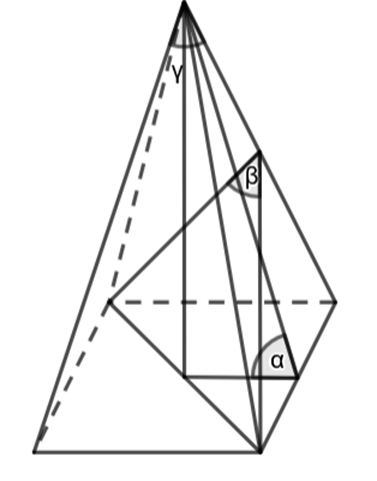 Zaznacz na rysunku ostrosłupa prawidłowego czworokątnego: kąt między ścianą boczną a podstawą, kąt między sąsiednimi ścianami bocznymi, kąt między przeciwległymi ścianami bocznymi.