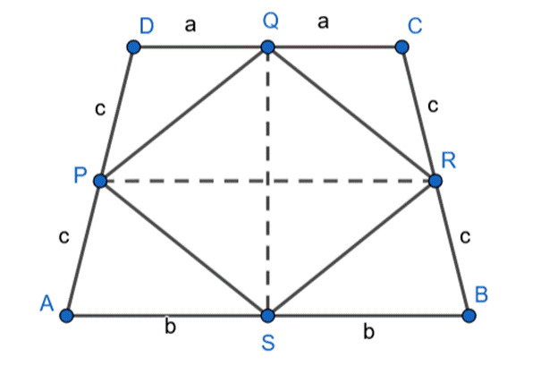 Udowodnij, że czworokąt PQRS jest rombem, jeśli punkty P, Q, R i S są środkami boków trapezu równoramiennego.