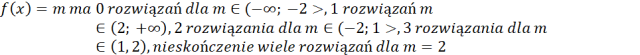 Odczytaj z wykresu własności funkcji. Na wykresie dziedzina funkcji to zbiór wszystkich x-ów dla których funkcja istnieje, a zbiór wartości to zbiór wszystkich y-ów. Miejscem zerowym funkcji jest taki argument x, dla którego wykres przecina oś x. Liczbę rozwiązań równania f(x)=m w zależności od warunku m możesz określić oceniając ile razy pozioma prosta y=m przecina wykres f(x).