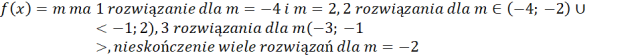 Odczytaj z wykresu własności funkcji. Na wykresie dziedzina funkcji to zbiór wszystkich x-ów dla których funkcja istnieje, a zbiór wartości to zbiór wszystkich y-ów. Miejscem zerowym funkcji jest taki argument x, dla którego wykres przecina oś x. Liczbę rozwiązań równania f(x)=m w zależności od warunku m możesz określić oceniając ile razy pozioma prosta y=m przecina wykres f(x).