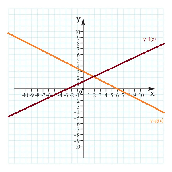 Narysuj dwie funkcję przecinające się w punkcie o współrzędnej x=2.