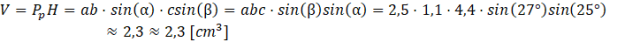 Wyznacz objętość graniastosłupa, wiedząc, że jego podstawą jest równoległobok, którego boku mają długości 2,5 cm oraz 1,1 cm, a kąt między nimi ma miarę 25°. Krawędź boczna wynosi c = 4,4 cm, a kąt jej nachylania do podstawy wynosi 27°. Wynik podaj z dokładnością do 0,1 cm3.