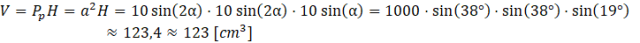 Wyznacz objętość prostopadłościanu, w którym odcinek łączący środek krawędzi bocznej z punktem przecięcia przekątnych dolnej podstawy wynosi 5 cm i którego kąt nachylenia do podstawy wynosi 𝛼 = 19°, a do ściany bocznej 2𝛼.