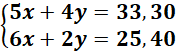 Za 5 opakowań jogurtu owocowego i cztery opakowania serka koziego Anna zapłaciła 33,30 zł. W tym samym sklepie za 6 opakowań identycznego jogurtu i 2 opakowania tego samego serka koziego Grzegorz zapłacił 25,40 zł. Wyznacz cenę jogurtu owocowego oraz serka koziego w tym sklepie.