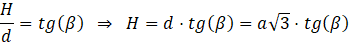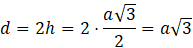Romb składa się z dwóch trójkątów równobocznych o boku a. Oblicz jego dłuższą przekątną (d), która jest równa dwóch wysokościom trójkąta równobocznego. Następnie z zależności trygonometrycznych wyznacz wysokość graniastosłupa i oblicz objętość bryły.