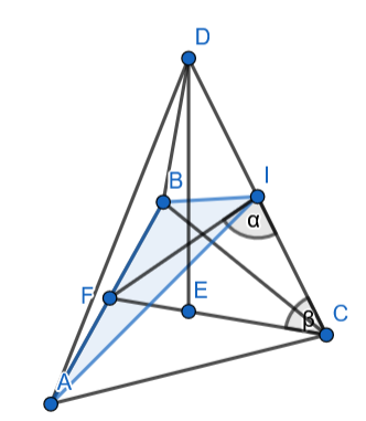 Skorzystaj z tego, że wysokości podstawy, wysokość czworościanu i jego krawędź boczna tworzą trójkąt prostokątny. Na tej podstawie oblicz cosinus zaznaczonego kąta, a następnie z jedynki trygonometrycznej sinus. Następnie skorzystaj z twierdzenia sinusów, aby wyznaczyć wysokość przekroju, a na koniec jego pole.