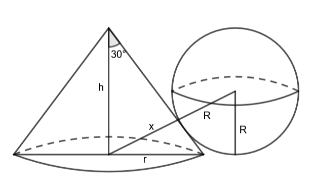 Wyznacz stosunek promienia kuli do promienia podstawy stożka, jeśli kula i stożek, postawione obok siebie na płaszczyźnie, stykają się powierzchniami. Odcinek łączący środek podstawy stożka ze środkiem kuli przechodzi przez punkt styczności tych powierzchni. Kąt między tworzącą stożka a jego wysokością jest równy .
