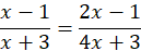 Wyznacz dziedzinę, wiedząc, że mianownik musi być różny od zera. Przemnóż równanie na krzyż, a następnie rozwiąż równanie. Wyznacz wartości x i sprawdź, czy należą do dziedziny.